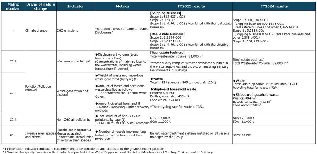 In this disclosure, we present the results for the indicators currently measured that correspond to the TNFD Global Core Metrics and the Shipping Sector Core Metrics. Going forward, based on the findings from the LEAP analysis conducted from last fiscal year through this fiscal year, we plan to consider establishing formal metrics and targets.