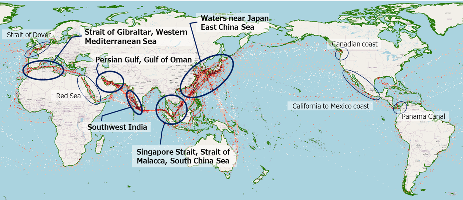 In offshore areas, we have identified six regions as caution areas: the waters off Japan (Pacific offshore zone), the southwestern coast of India, the Strait of Malacca, the offshore area of the Gulf of Oman, the vicinity of the Strait of Gibraltar and the western Mediterranean, and the southern South China Sea.