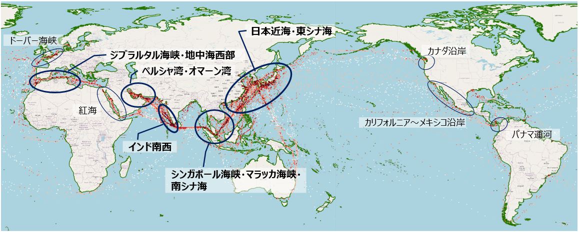 一方、外洋域では、日本近海(太平洋沖合域)、インド南西部沖合、マラッカ海峡、オマーン湾沖合域、ジブラルタル海峡周辺および地中海西部沖合域、南シナ海南部の6海域が要注意地域として整理しています。