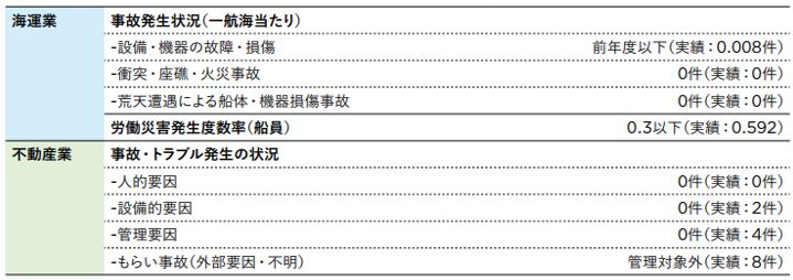 飯野海運グループでは、企業理念で最優先に掲げる安全の確保に関し、サステナビリティ基本方針においても「飯野海運グループは、安全の確保を経営上の最優先課題とします。」と定め、従業員や業務委託先を含む取引先の安全の確保を目指しています。事業活動に伴い発生する人命、船舶、ビルの安全を脅かす災害対策や事故の原因究明および再発防止策を協議し、予防措置も含めた安全対策の徹底と強化を図っています。2025年度の主な目標として、海運業では、イイノマリンサービス株式会社(IMS)の管理船において一航海当たりの事故の発生を0件、船員の労働災害発生度数率を0.3以下と設定し、不動産業では、イイノ・ビルテック株式会社(IBT)の労災認定者数を0件にすること、事故・トラブル発生の減少(人的要因:0件以下、設備的要因:0件以下、管理要因:0件以下)を目標としています。また、当社グループは中期経営計画において重大事故発生件数を0件(2024年度実績0件)とする非財務数値目標を掲げ、安全の確保に積極的に取組んでいます。