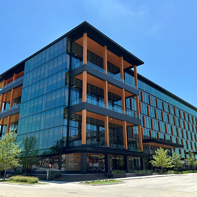 - The building uses approximately 4,000 meters of wood, significantly reducing CO2 emissions during construction compared to typical reinforced concrete (RC) construction, and is one of the largest wood-frame office buildings in the Dallas area.